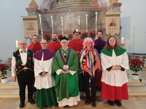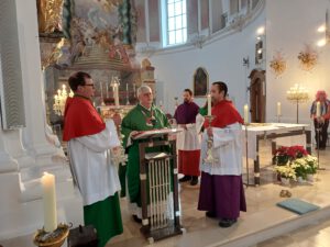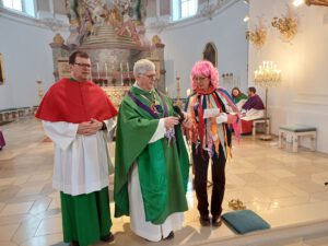 In der Wallfahrtskirche Herrgottsruh in Friedberg wurde am Sonntag, dem 15. Februar 2026, wieder ein froher und bunter Faschingsgottesdienst gefeiert. Noch vor der Messe ergriff Kantorin Martina Steinbach schon das Wort und machte der Gemeinde bekannt, dass in dieser Messe auf ihr Kommando beim Gesang und Gebet zu hören sei. Als die Sakristei Glocke um Punkt Zehn Uhr erklang, setzte Organist Roland Plomer mit dem Radetzkymarsch von Johann Strauß den ersten musikalischen Akzent. Die bunt gekleidete liturgische Schar um Wallfahrtsdirektor Pater Hans-Joachim Winkens konnte so sehr festlich in die Kirche einziehen. Zum Marsch und Einzug der liturgischen Prozession klatsche sich die zahlreiche Gottesdienstbesucherschar schon mal im Rhythmus warm. Beim Eröffnungslied erschallte laut das „Servus, Grüezi und Hallo, diese Messe ist der Hit und wir alle feiern mit.“ Damit war der fröhliche Ton für das Hochamt in der Wallfahrtskirche gesetzt. In tiefer Bußgesinnung sang die Gemeinde dann mit der Kantorin Steinbach „Wir sind alle kleine Sünderlein“. … „Der Herrgott wird es uns bestimmt verzeih ‘n“. Nach dem Kyrie erklang beim „Ehre sei Gott in der Höhe“ als Refrain: „Die Hände zum Himmel, kommt lasst uns fröhlich sein. Wir klatschen zusammen und keiner ist allein“. Nach diesem fröhlichen Einstieg in das Hochamt mit Gesang, Orgel und Gebet nahm der Gottesdienst seinen gewohnten Verlauf. Die Tageslesungen und das Evangelium behielten ihren würdigen Platz und wurden vom Wallfahrtsdirektor Winkens den Zuhörern erschlossen: Die Gebote Gottes helfen uns das Leben zu meistern. Sie sind ein Treppengeländer, an dem wir uns im Alltag festhalten können. Die Gebote helfen uns im Leben Haltung zu bewahren, wenn wir als Christen gefordert sind. Nicht nur im Karneval dürfen wir unserer Obrigkeit und den menschenverachtenden Despoten in der Welt widersprechen und Einhalt gebieten. Pater Winkens erwähnte in diesem Kontext die Ermordung durch ein hochgiftiges Froschgift von Alexej Nawalny (+ 2024) durch Putin vor zwei Jahren. Dieser Mord wurde jetzt zum zweiten Todestag von mehreren europäischen Regierungen offiziell bestätigt. Nach der Predigt wurde der Wallfahrtsdirektor Pater Winkens von seinem närrischen Kirchenvorstandsmitglied Richard Mayr überrascht und bekam den ersten Orden der Wallfahrtskirche überreicht. Die damit verbundene Bußübung, zehnmal barfuß um die Wallfahrtskirche zu pilgern, delegierte der Wallfahrtsdirektor bei seinem Dankeswort gleich an sein anwesendes Kirchenvorstandsmitglied, da seine Podologin ihm dies angesichts des Diabetes verboten hat. Froh wurde der Gottesdienst weitergefeiert. Noch manche karnevalistischen Melodien von allseits bekannten Faschingsliedern waren als Orgelimprovisationen zu hören. Abschließender Höhepunkt der Messe am Faschingssonntag war die Büttenrede „Saugut“ von Richard Mayr. Oft zu Tränen gerührt oder laut lachend vernahm die Gemeinde die vielen Möglichkeiten der deutschen Sprache das Wort „Sau“ mal als gute oder schlechte Variante zu gebrauchen. Nach dem Segen und dem Abschluss der Messe erklang dann als Dankgesang der Gemeinde ein frohes „So ein Tag, so wunderschön wie heute“. So war der Fasching in diesem Jahr eine gute Gelegenheit einen frohen und Mut machenden Gottesdienst in der Wallfahrtskirche zu erleben. Aber unter uns: Das ist doch eigentlich jeden Sonntag so. (Pater Winkens)